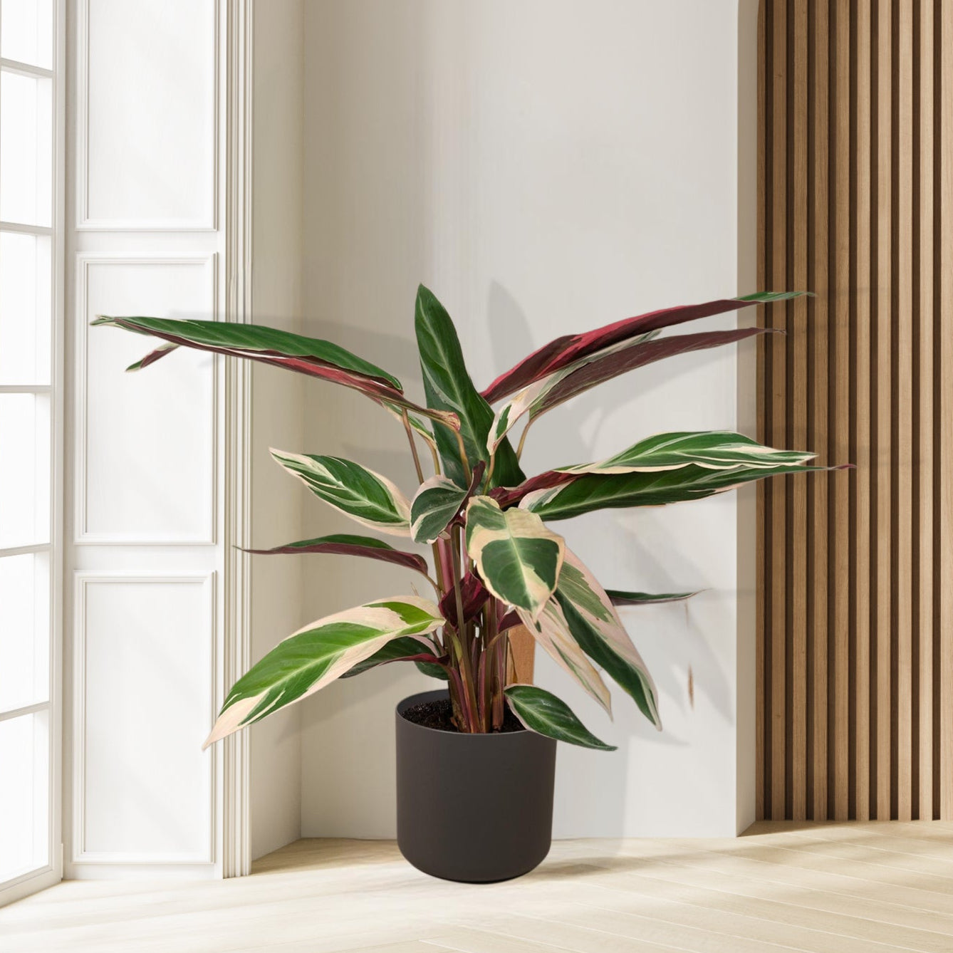 De Calathea Triostar, ook wel Pauwenplant genoemd, is een echte blikvanger met zijn kleurrijke en gestreepte bladeren in groen, roze en wit. Deze plant voegt een vleugje exotische charme toe aan je interieur en is ideaal voor iedereen die houdt van opvallende planten met een speelse uitstraling. Perfect voor zowel beginnende als ervaren plantliefhebbers!